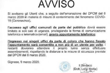 SI RICORDA CHE L'ACCESSO AGLI UFFICI COMUNALI E' CONSENTITO SOLO PREVIO APPUNTAMENTO TELEFONICO.