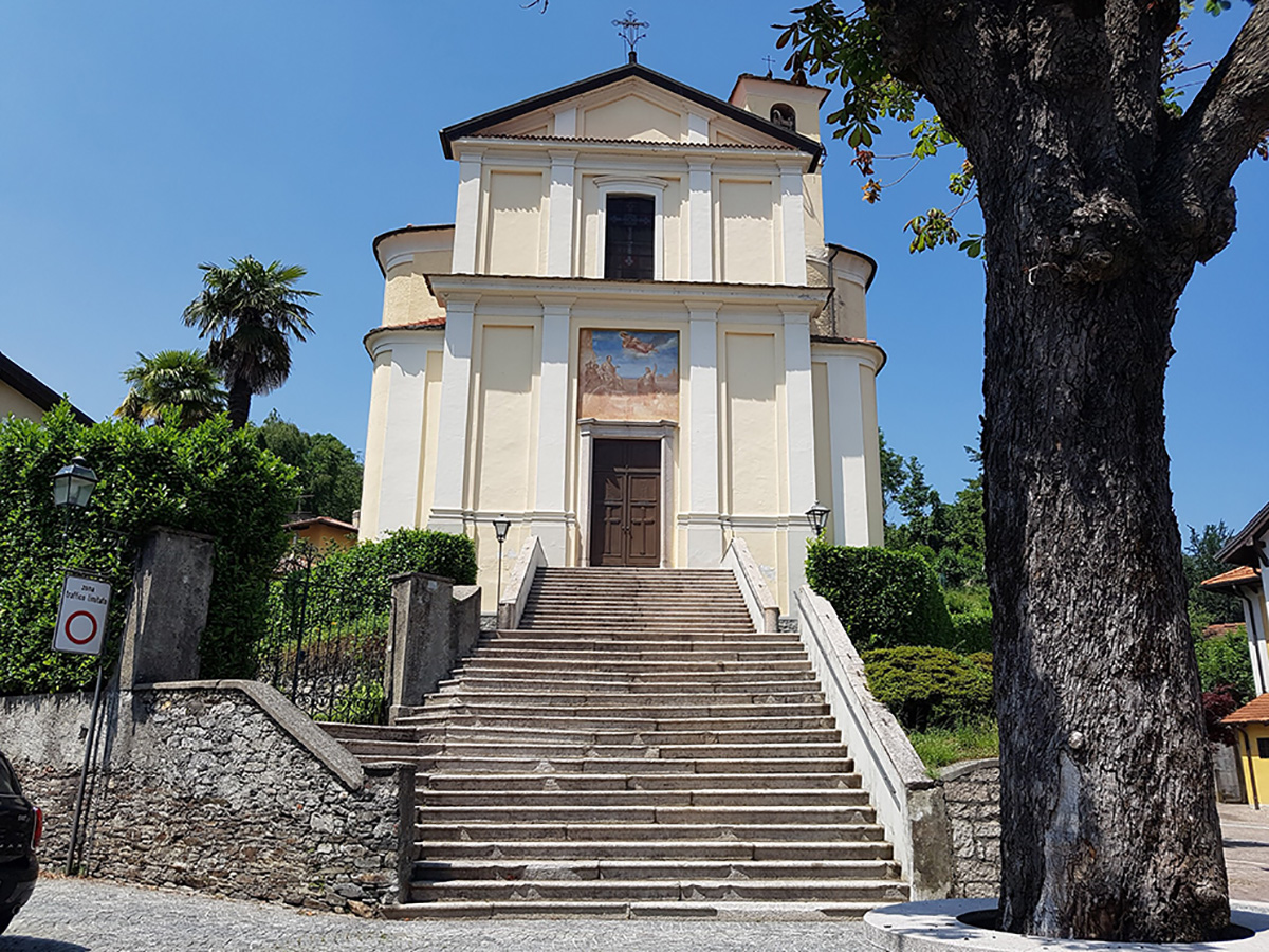 L'attuale edificio, di ordine corinzio e, secondo taluni, su disegno del canonico Zanoia, fu costruito verso il 1790 su terreno donato nel 1781 da don Carlo Bartolomeo De Antonis di Vezzo.